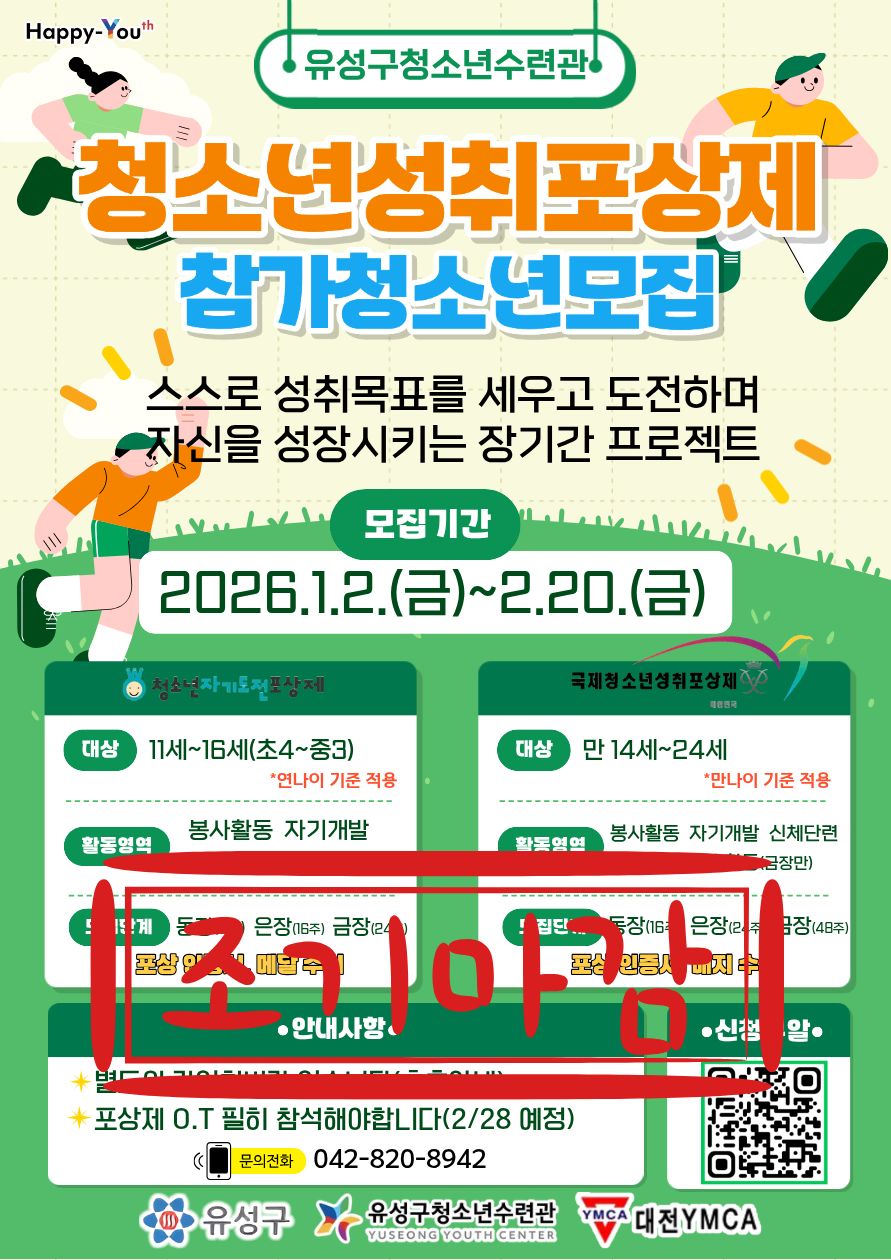 2026년도 청소년포상제에 관심을 갖고 신청해주셔서 감사합니다. 모집인원이 초과하여 조기마감 되었음을 알려드립니다.