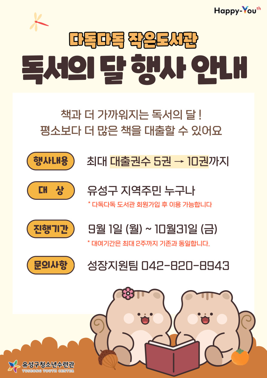 📚 독서의 달 행사 안내 📚책과 더 가까워지는 독서의 달!'다독다독 작은도서관'에서평소보다 더 많은 책을 대출할 수 있어요!─────────────────────📖 대출 권수 확대기존 5권 → 최대 10권📅 행사 기간9월 · 10월 (단 두 달간 진행)─────────────────────자세한 사항은 포스터를 참고해주세요 :)