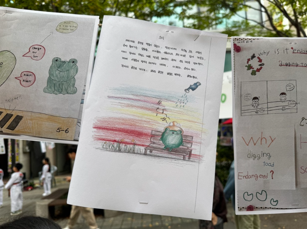 체험활동에 앞서 " 왜 맹꽁이 장날일까요?"라는 질문을 던지며 지역사회와 생태 환경에 대한 관심을 높이는 시간을 가졌습니다. 이후 맹꽁이 생태 교육 및 사진전을 관람하며 멸종위기종인 맹꽁이에 대해 알아보고, 의미를 되새겼습니다.